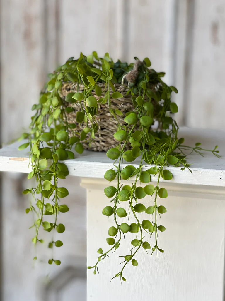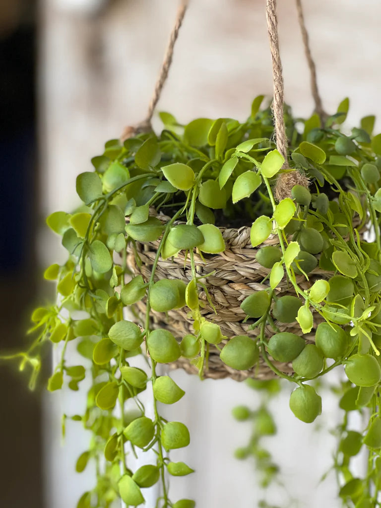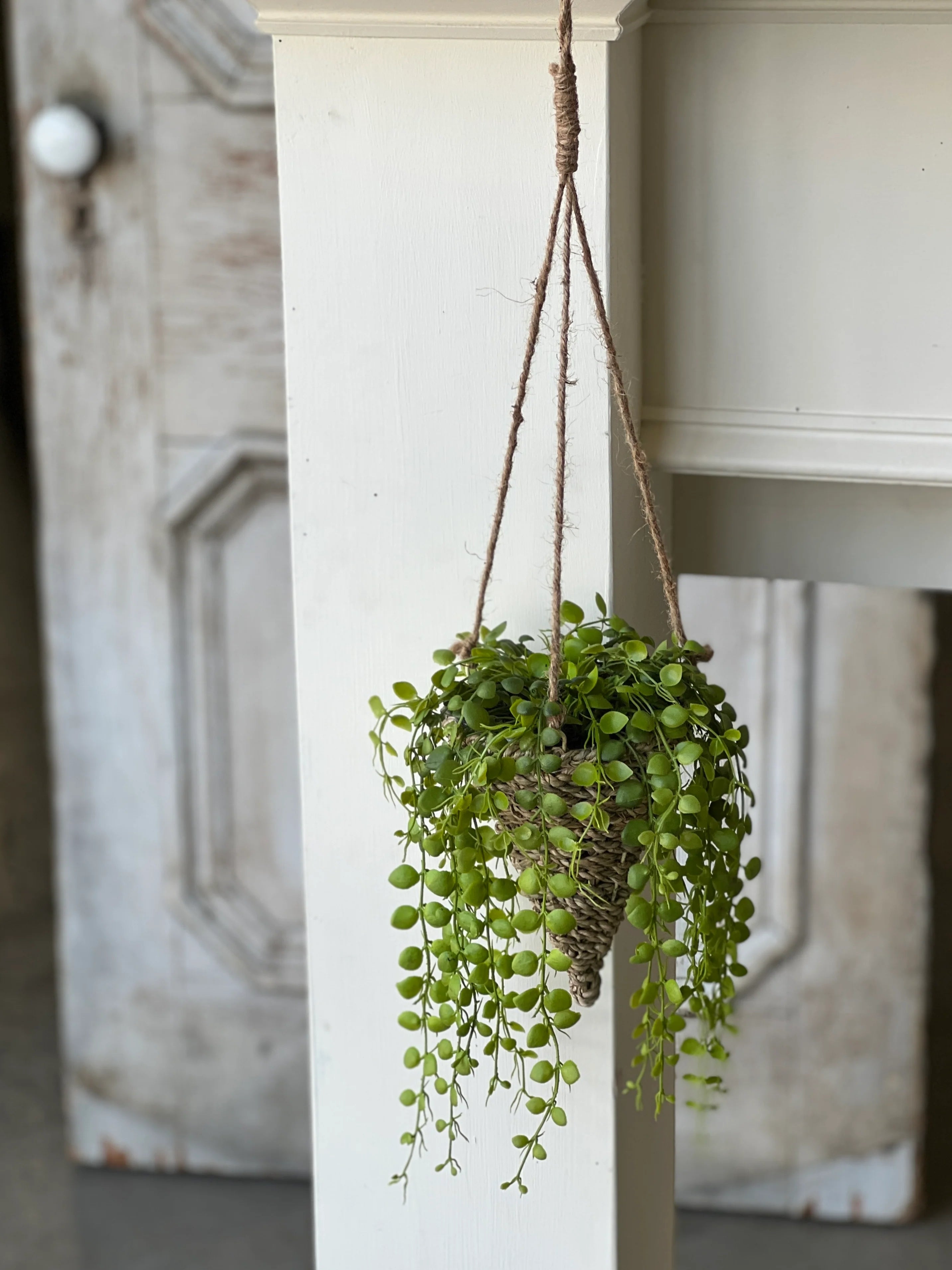Charming hanging baskets with draping tendrils of greenery add just the right punch of greenery to any area or space! Rattan baskets are suspended with rope hangers. Available in two sizes/styles, each sold separately.