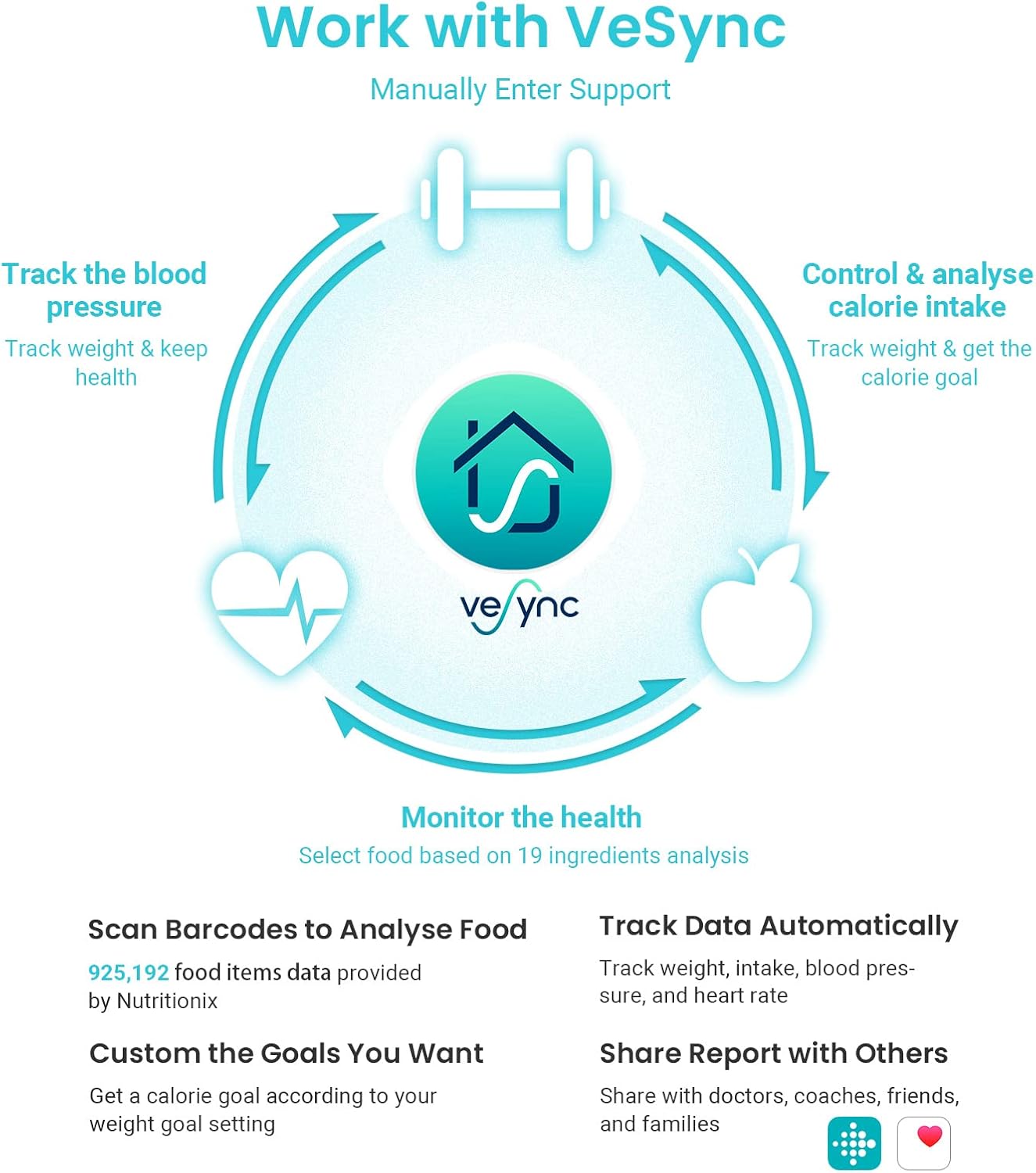 - 𝙄𝙈𝙈𝙀𝙍𝙎𝙄𝙑𝙀 𝘼𝙋𝙋 𝙀𝙓𝙋𝙀𝙍𝙄𝙀𝙉𝘾𝙀: Free Vesync APP can sync information with Apple Health, Google Fit, FitBit, MyFitnessPal and Samsung Health. Set goals on APP, record exercise and food calories, track your progress with data graphs
