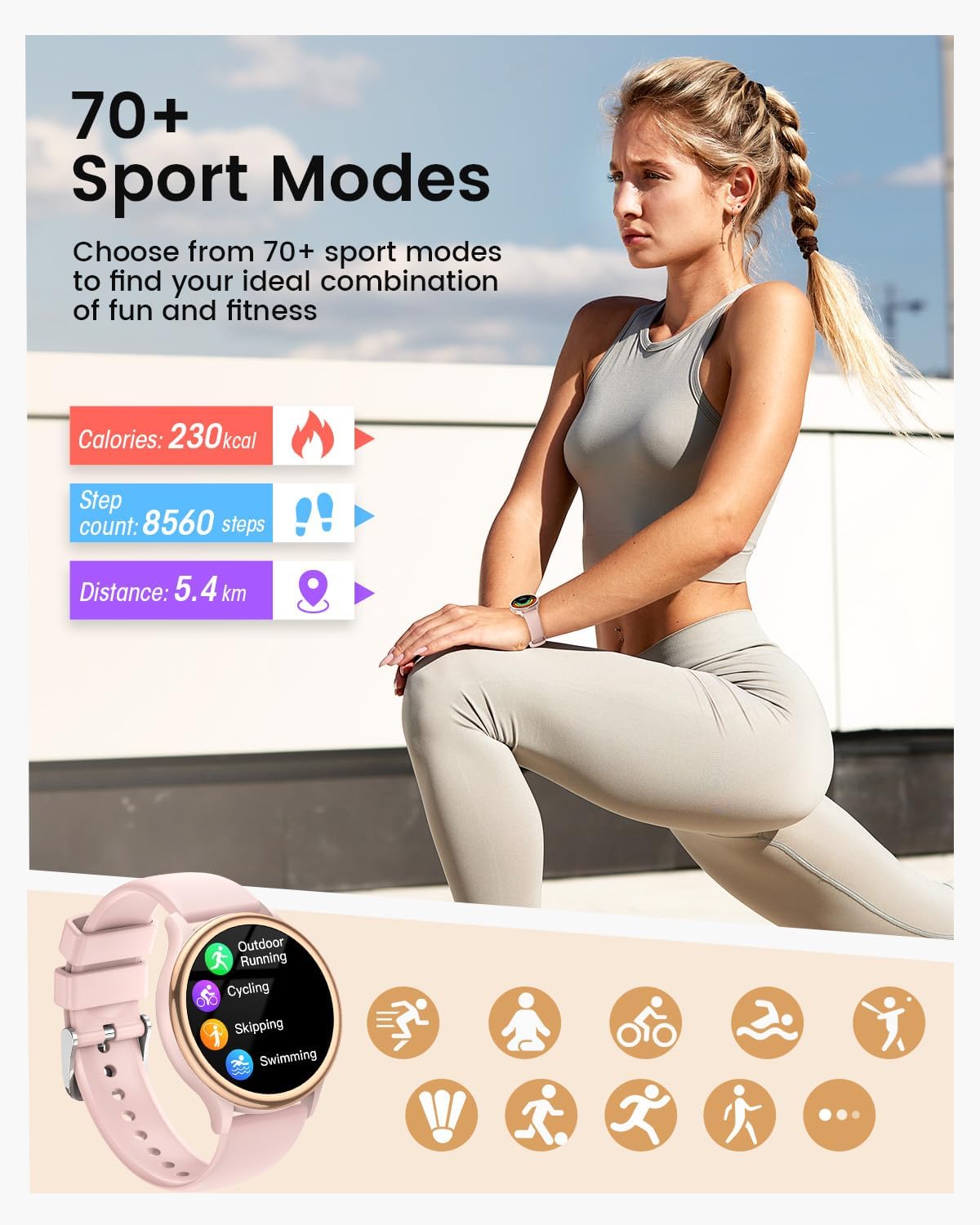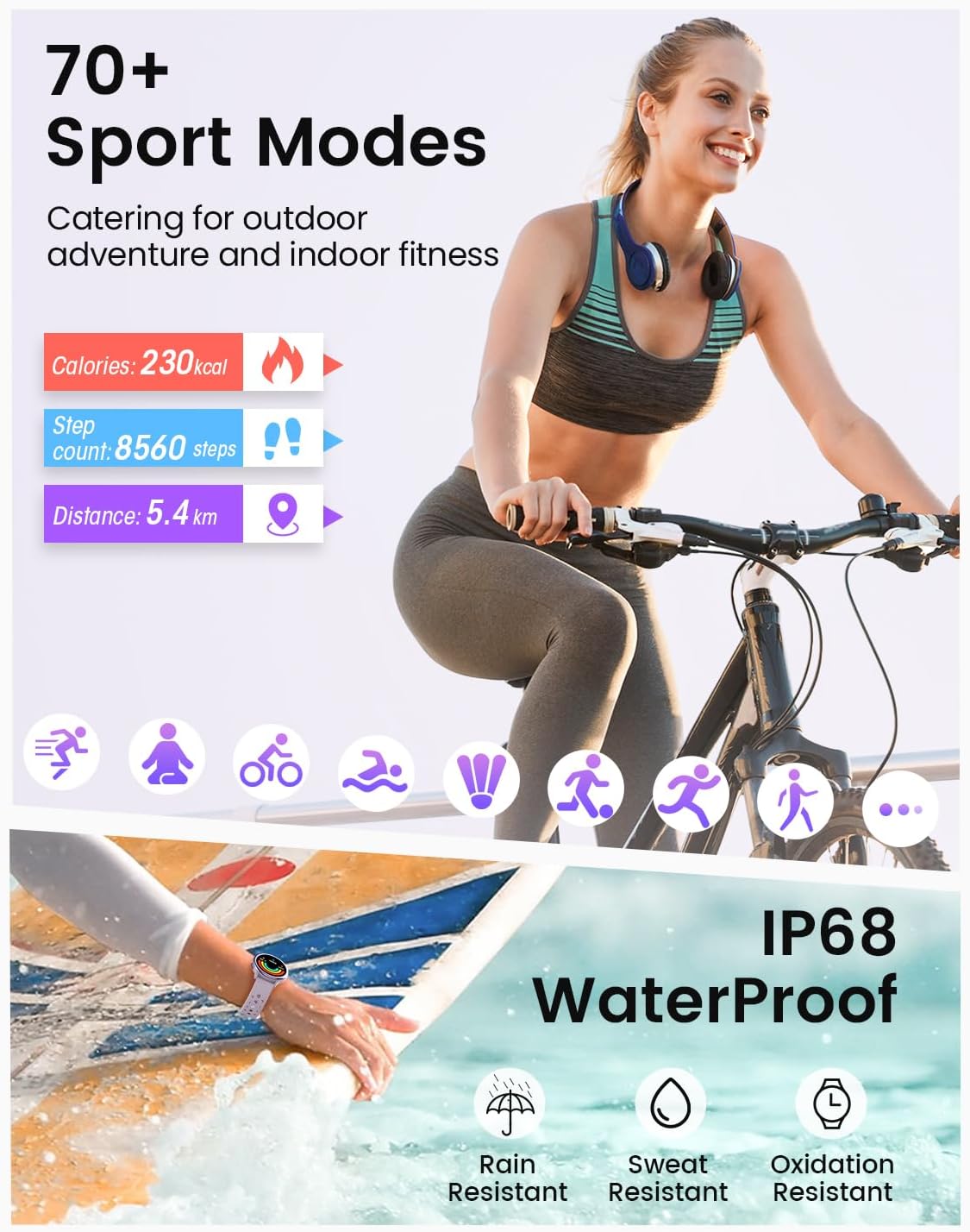 - Fitness Companion: Stay active with over 70 tailored sports modes, from yoga and running to cycling and rowing. Featuring an IP68 waterproof rating, it delivers detailed workout reports, helping you reach your goals with ease.
