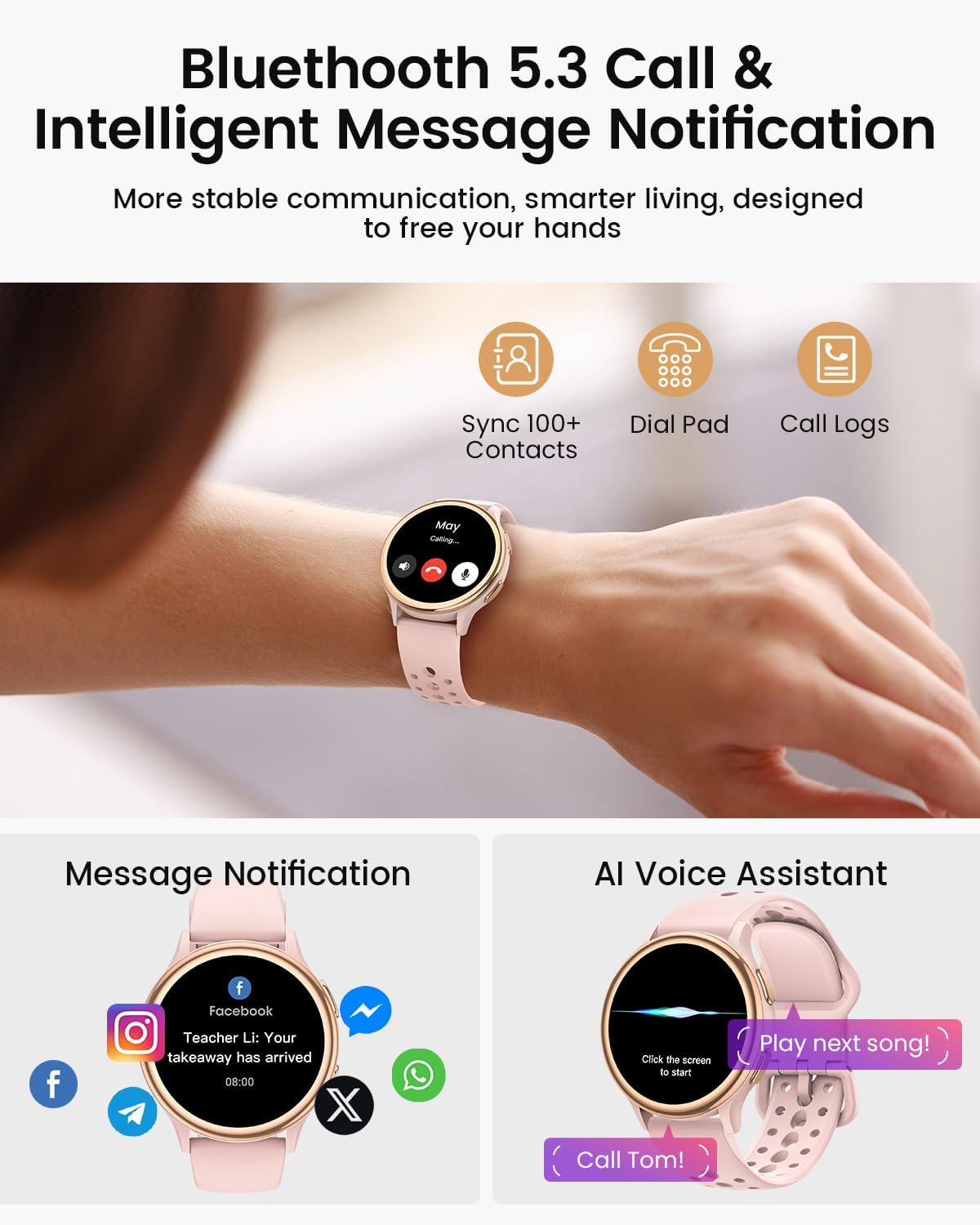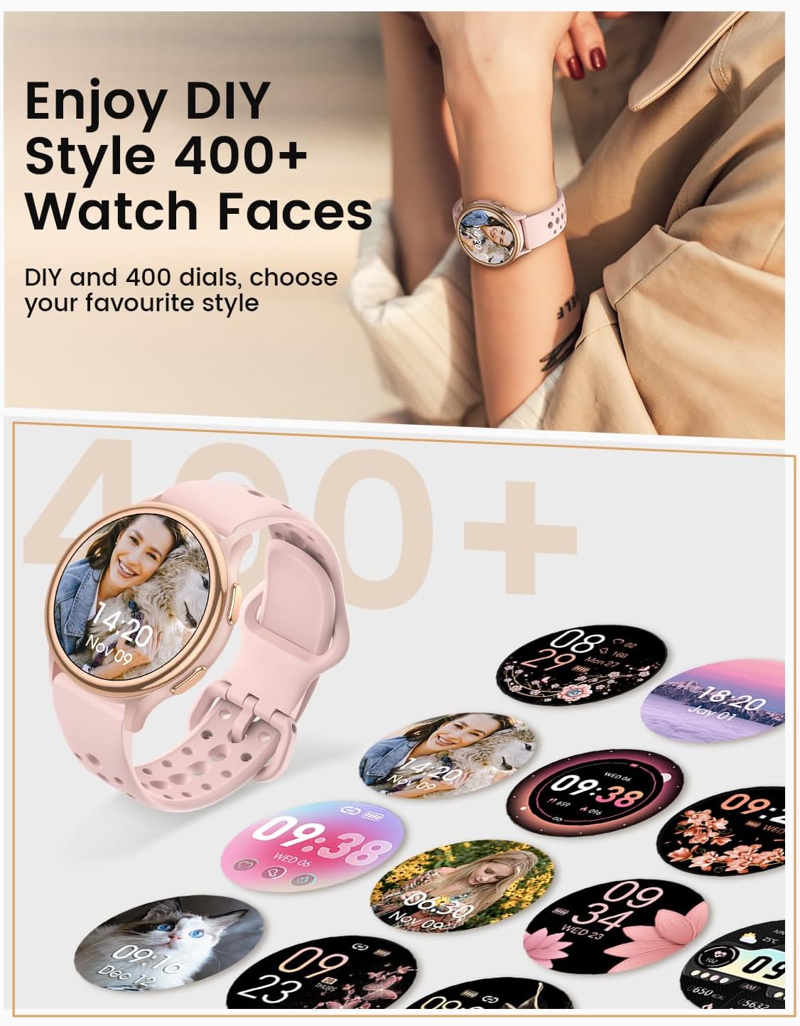 - Stylish and Versatile Design: With over 400 stunning watch faces and two elegant straps (a woven band and soft silicone bands), this chic smart watch seamlessly transitions from the gym to a night out, complementing your style effortlessly.